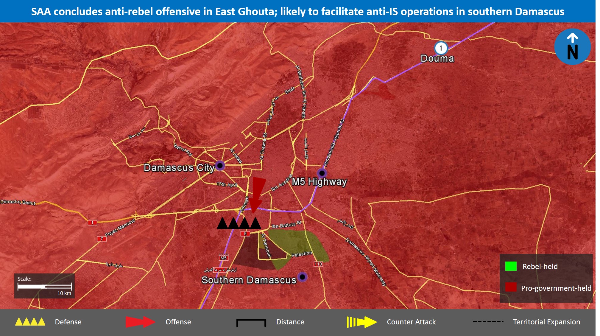 - We assess that the SAA’s clearing of Damascus’ East Ghouta region will enable the pro-government forces to launch large-scale operations against their adversaries on other fronts over the coming weeks. A particular priority over the short term likely lies in fully securing the Damascus area in the short term. Moreover, the SAA has now fully secured the M5 Highway, which connects Damascus to Homs, Hama, and Idlib provinces. Thus, it remains likely that pro-government forces will also intensify their ongoing anti-rebel operations in northern Hama and Idlib provinces over the coming months.