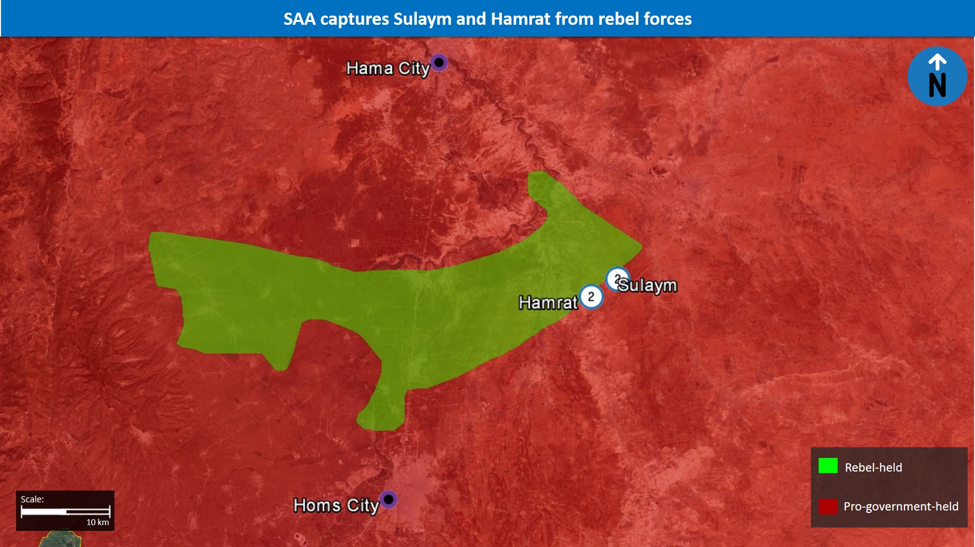 | 2 | April 15 | Sulaym, Hamrat | The SAA captures Sulaym and Hamrat after failed negotiations between the Syrian government and rebels regarding an evacuation deal in Hama Province |